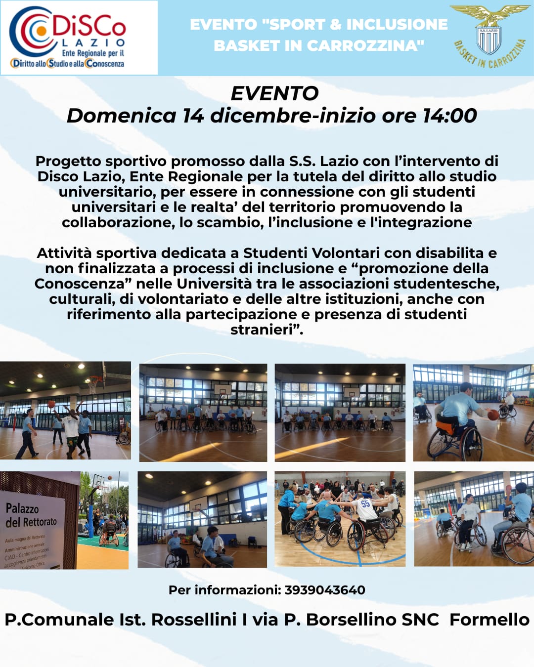E dopo l’evento del sette dicembre svolto a Tor di Quinto, nel complesso sportivo Sapienza Sport, questa domenica l’evento SPORT & INCLUSIONE E BASKET IN CARROZZINA si svolge a Formello, evento che la Lazio basket in carrozzina esegue insieme a Disco Lazio.