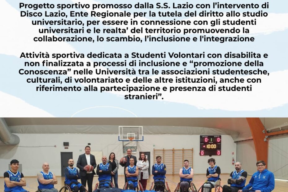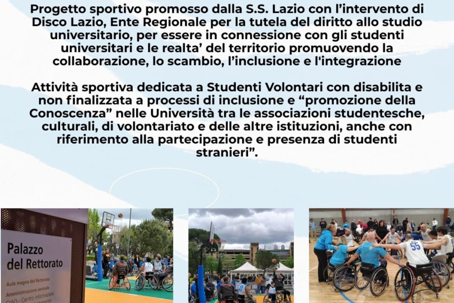 Venerdì ore 14:00 al centro sportivo La Sapienza di tor di Quinto, si svolge l’evento SPORT & INCLUSIONE E BASKET IN CARROZZINA, la ASD Lazio… Leggi tutto »Venerdì ore 14:00 al Centro Universitario La Sapienza di Tor di Quinto si svolge l’evento SPORT & INCLUSIONE E BASKET IN CARROZZINA